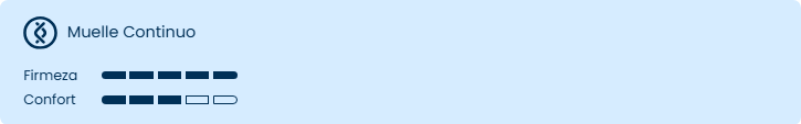 - Firmeza: firme. Gracias al sistema Zone Support Pro, ofrece un soporte diferenciado por zonas, reforzando especialmente la zona lumbar. Los muelles Multielástic® proporcionan una firmeza progresiva que se adapta a la presión ejercida, garantizando estabilidad y confort a lo largo del tiempo.